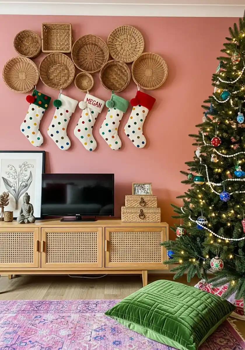 A blush wall becomes instant art with a gallery of woven baskets. Let the rims double as hooks for polka-dot stockings, which is honestly genius and renter friendly. Cane furniture, a jade velvet floor cushion, and a tree filled with quirky keepsake ornaments make the corner feel boho meets mid-century.