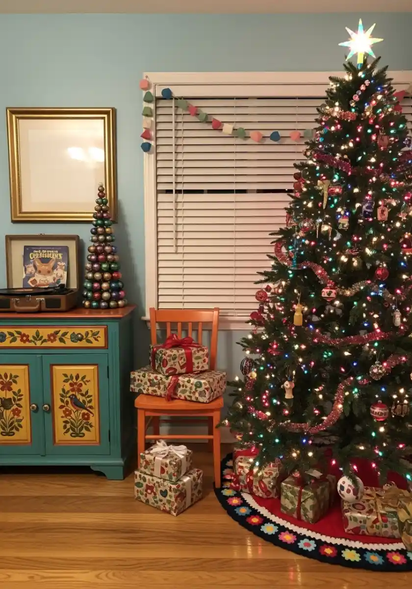 A turquoise folk-painted cabinet with bird-and-flower doors sits next to a classic tree dripping in multicolor lights and pink tinsel. On the cabinet, a cone tree made from shiny ornaments stands by an open vintage record player and quirky album cover. Pastel heart garlands swag across the blinds, while an orange chair holds folk-patterned gifts. A crocheted skirt with daisy motifs pops against hardwood floors.