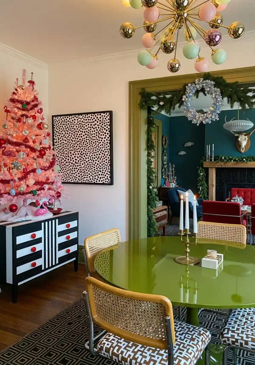 To get the vibe, pick one “wow” color for the tree, then repeat it on the ceiling fixture or art. Pastel glam is a playful branch of eclectic holiday decor that still feels grown up. Keep metals warm, like brass, so the candy colors feel cozy not cold.