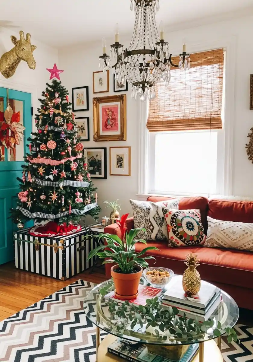If you’ve got bold art, pull colors straight from it for your tree. Use beads on the chandelier instead of garland on the tree for a smart swap. This is fearless eclectic Christmas decorating that turns dinner into a conversation party.