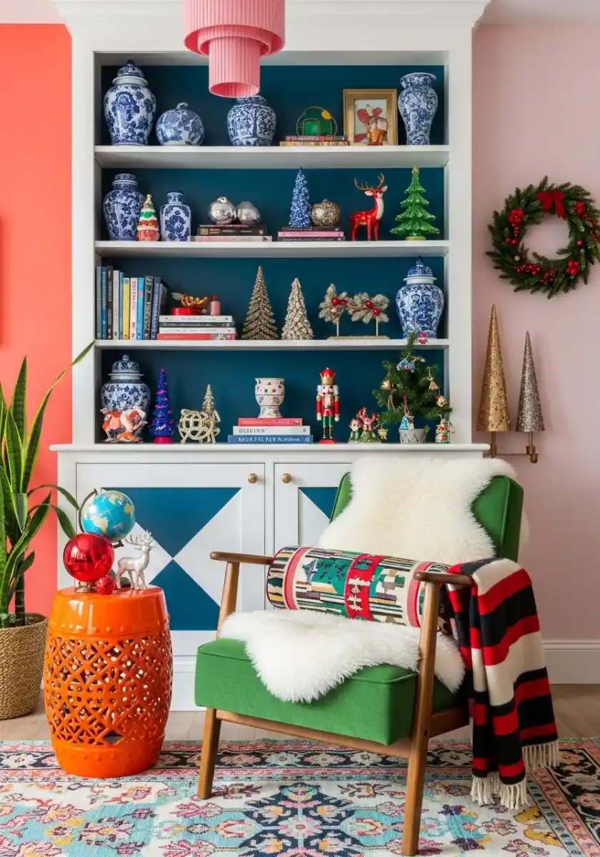 Peacock-blue shelves become a stage for chinoiserie jars, bottle-brush forests, nutcrackers, and shiny deer. A kelly-green chair layered with sheepskin sits beside a punchy orange garden stool topped with ornaments. A bright global rug on the floor ties the colors together.
