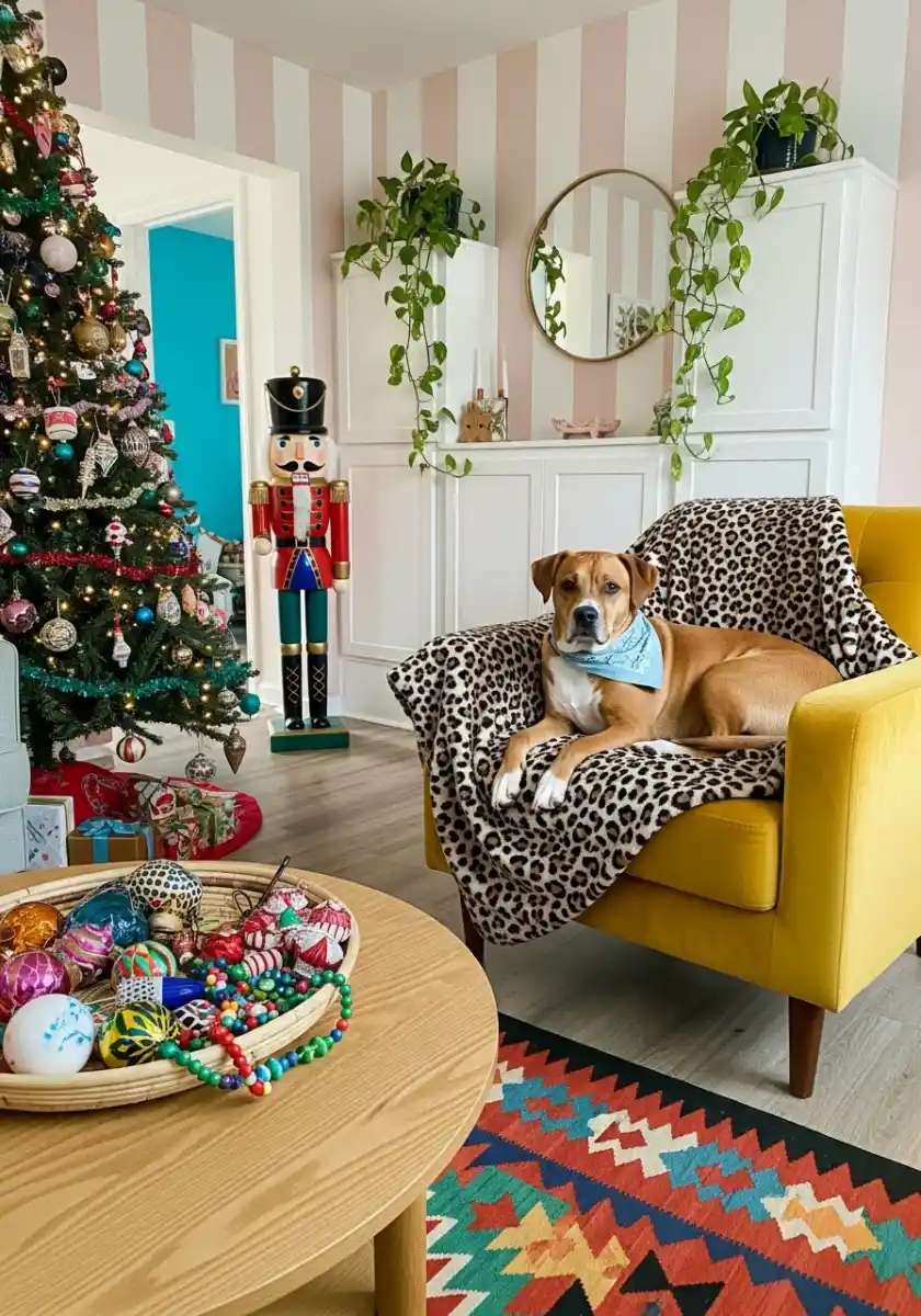 Soft blush wall stripes and trailing plants meet a towering nutcracker and a tree dripping with colorful baubles. A mustard chair thrown with leopard print, plus a tray of mismatched ornaments on the coffee table, nail that carefree collected look.