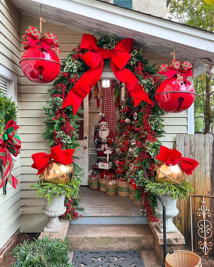 Elegant Christmas Decor: Big-bow porch with bells and berry garlands