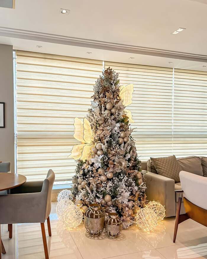 This final scene whispers luxury. The tree mixes champagne, taupe, and ivory, with huge translucent leaves that light up from behind. On the floor, two woven light spheres and patterned metallic jars sparkle softly. Everything is tone on tone, which is why it looks so expensive. My wallet sighed in relief when I realized the secret is color discipline, not buying the store.