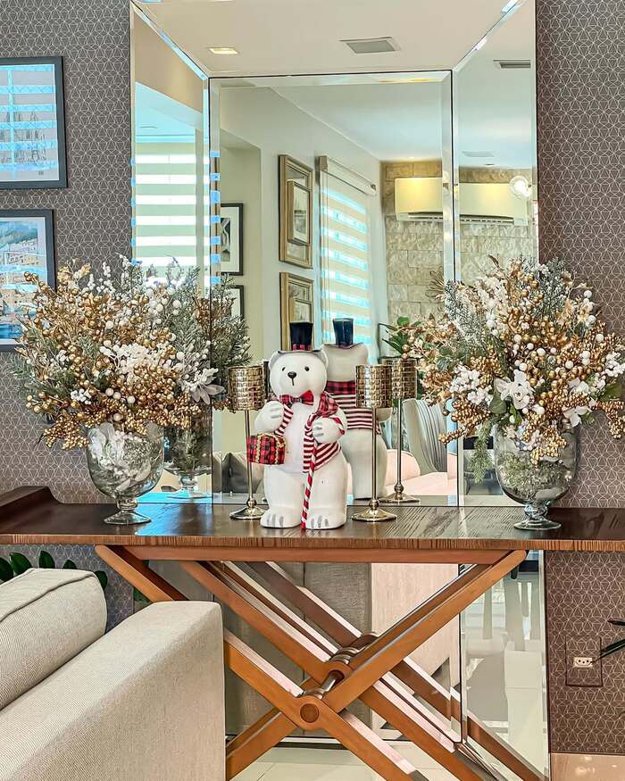 This console vignette made me stop and zoom in like three times. A tall faceted mirror doubles the glow, flanked by two lush winter bouquets in glass urns. Right in the middle sits a toy bear in a top hat, and somehow it feels charming not cheesy. That balance is why elegant Christmas decorations work. You need one playful note, then surround it with refined texture like metallic stems and crystal.