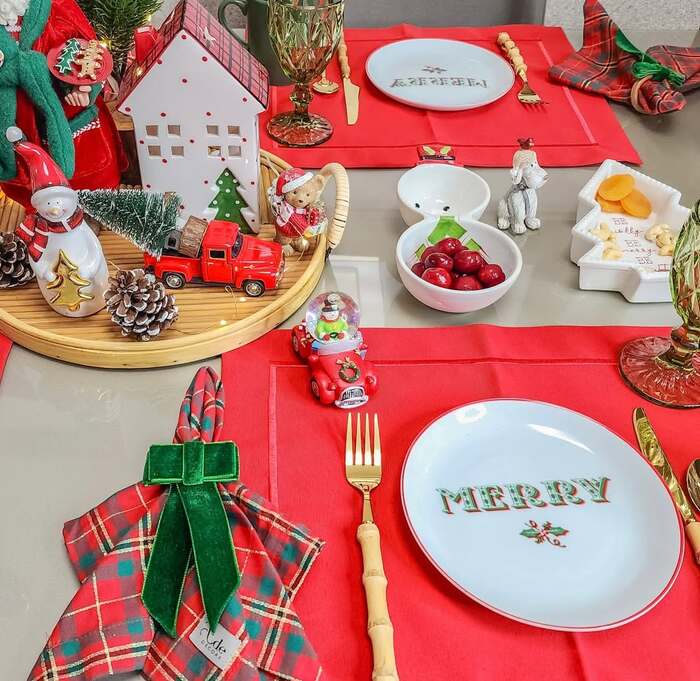 I love a formal table, but I also love eating without bumping three centerpieces. This setting nails both. Red placemats and bamboo flatware feel festive and a little retro. Tartan napkins tied with velvet ribbon make it cozy. The plates read MERRY in a vintage font which is on theme without yelling. My confession, I used to mix too many patterns. The plaid plus the lettering is plenty. Let the food be the rest.