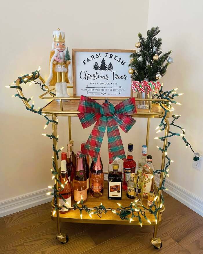 Nothing says party like a bar cart, and this one earns its gold finish. A big plaid bow on the front sets the mood. A small tree, a nutcracker, striped candy canes, and a framed print create a top shelf story. Then the lights drape around the rail like jewelry. It’s festive and functional. The trick to keep it chic is edit the bottles. Not every bottle you own belongs on the cart.