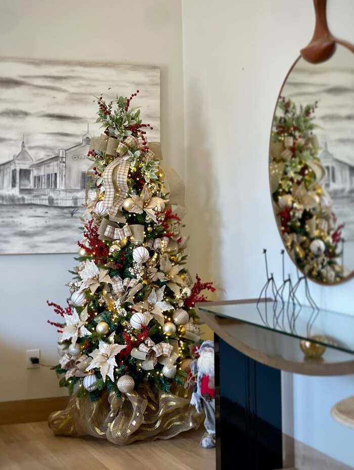 I’m a ribbon person, and this tree goes all in. Gold bows, plaid tails, poinsettias, and berry sprays layer into a cone that still shows plenty of green. The base is wrapped in wide metallic mesh that puddles like fabric. It’s theater, but tasteful. My personal mistake in the past was cutting ribbon too short. Long tails feel generous and classy.