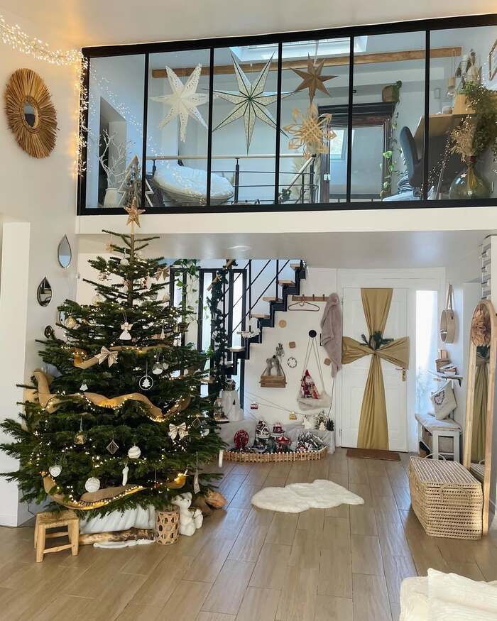 To copy it, stick to three finishes only: natural wood, soft white, and one metallic. Hang the paper stars in odd numbers and vary sizes so the constellation feels real. On the tree, use matte ornaments, wood beads, and a little linen ribbon, nothing shouty. The effect is refined elegant holiday decorations with a Scandinavian wink. If you have kids, place a sheepskin rug under the tree for cozy story time. It looks fancy but it’s basically a cuddle zone.