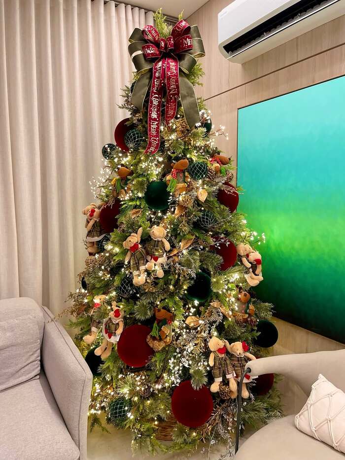 This tree stole my heart first. The oversized velvet bow on top reads special right away, and the mix of deep green, burgundy, and soft gold lights is peak elegant christmas decor. If you’re going for classy Christmas decor, try grouping ornaments by finish. Velvet balls together, matte together, shiny together. This creates quiet rhythm so the eyes don’t get tired. The teddy ornaments add whimsy that kids love, but because they’re in warm plaid and neutral outfits, the look stays refined Christmas decor not kiddie.
