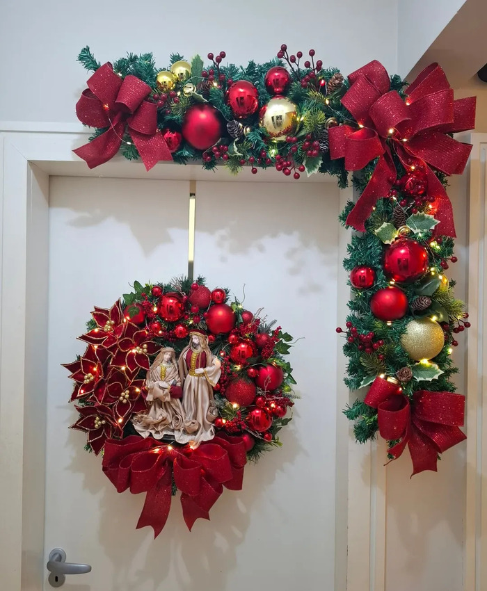 There’s something so welcoming about a doorway framed in volume. This garland uses big red ornaments, glitter berries, and structured bows, so it lands as elegant holiday decor instead of craft hour. The wreath featuring a nativity scene grounds the red in meaning. Tip from my own overthinking brain: repeat the dominant bow style at least three times. Top left, top right, then center or bottom. That balance reads intentional.
