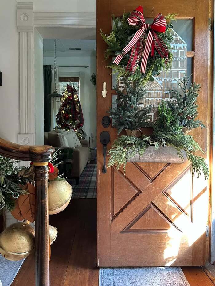 To bring it from pretty to polished holiday styling, hang a simple wreath higher than you think, so it lines up with the glass design. Add two small bells on the door handle for sound and shine. If you’re in a small space, a narrow entry like this still reads elegant christmas decor when you keep the ribbon tails long and the bow proportion big. Yes, bigger than your gut says. Trust.
