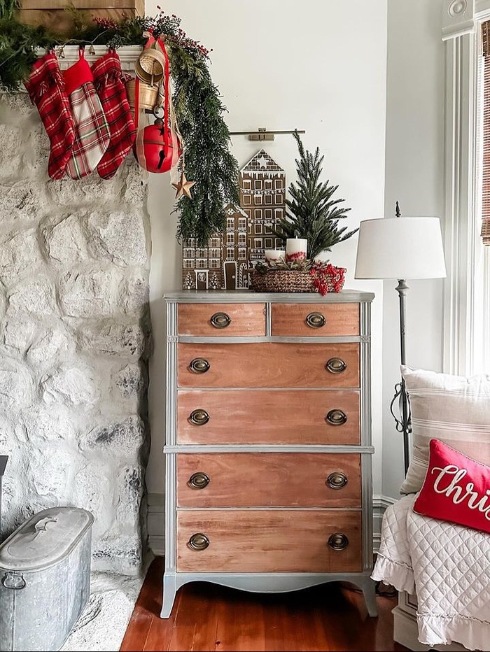 I love a nook that feels like a cozy secret. The stone chimney, the vintage-style dresser, and the plaid stockings are a mash of rustic and refined. What makes it sophisticated Christmas decor is the restraint. The dresser top has one main vignette: a basket tray with a tiny tree, candle, and a gingerbread town print layered behind. Layering art behind decor instantly feels collected, like you’ve been at this for years, even if you just bought it yesterday like me.