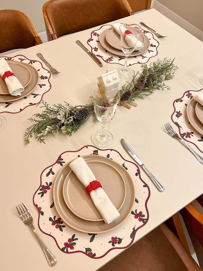 Understated tables make me breathe easier. The scalloped placemats with red berry motifs feel sweet, and the neutral plates and napkins keep things calm. To recreate, start with a clean cloth or bare table if yours is pretty. Run a thin evergreen garland down the center, add two pinecones per place, and a tiny ceramic house for a little story moment. That hits graceful Christmas decorations without clutter.