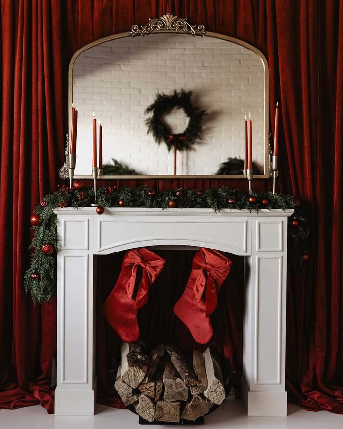 Okay, I gasped at this one. Heavy velvet curtains framing a white mantel, red taper candles, a wide antique mirror, and stockings with fat bows. It’s dramatic and still elegant festive decor. The trick is repetition in texture. Velvet on the drapes echoes the stockings and ribbon, so the scene feels unified. The mirror doubles the wreath and lights, which is smart if your room needs extra sparkle without extra stuff.