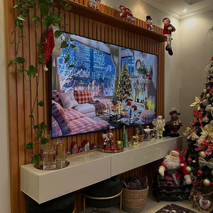 This is proof your media wall can be pretty. The wood slat wall brings warmth, the floating console keeps lines clean, and the display of Santas and tiny village houses feels like a collected story. To keep it sophisticated Christmas decor, group by color. Whites together, reds together, greenery in repeated spots. Then let one item be tall, like a bottle brush tree, so your eye has a path.