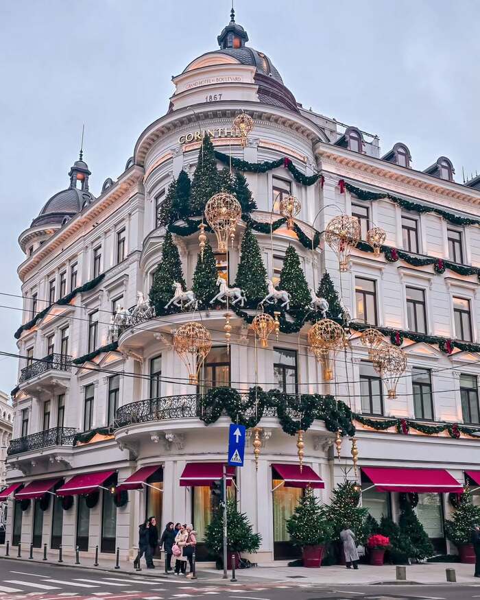 This building is the reason I got stuck scrolling for way too long. Thick garland swags run across every balcony. Pyramids of trees rise like little forests, and gold hot-air-balloon ornaments float along the railings with tiny carousel horses prancing between. The repeating red bows tie all floors together. It’s theatrical and still tasteful, like a movie set you can walk through.