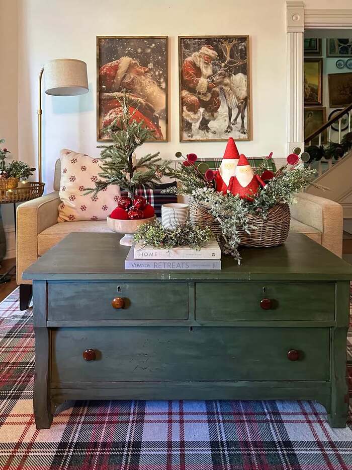 This space hits me right in the nostalgia. Two vintage-style Santa prints hang above a mustard sofa. A deep green trunk plays coffee table and sits on a plaid rug. Baskets, berries, and a tiny tabletop tree make the scene cozy, not cluttered. It’s that mix of heirloom and handmade I try to get right every year, and sometimes I overdo it. Not here.
