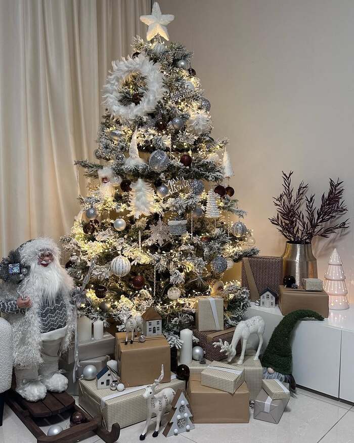 This tree is winter calm. Flocked branches hold silver and pearl ornaments, with a few chocolate brown ones tucked in for depth. At the base, kraft-wrapped gifts, little wood houses, and white deer gather like a tiny village. Even the Santa is dressed in gray and white, which I didn’t know I needed until now. The lights are warm, the vibe is hush, and the room glows like early snowfall.
