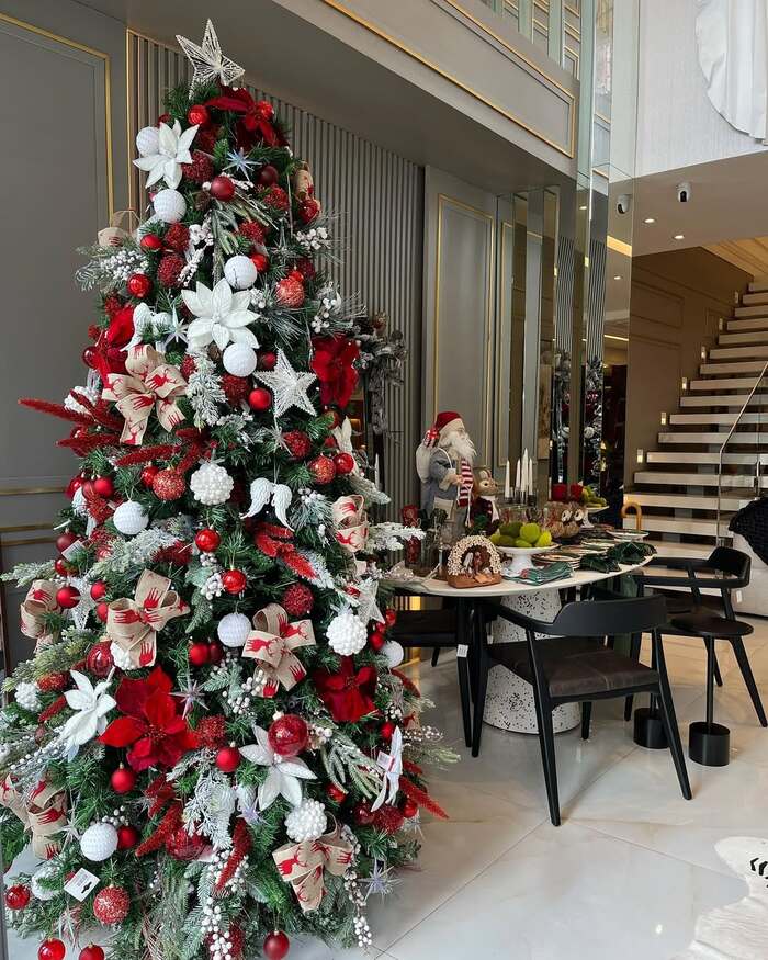 This tree scores all the traditional points and still feels fresh. Poinsettias, ribbon tails, berries, and snow-dusted sprigs fill a tall tree placed by a sleek dining set. White ornaments keep it bright, red ones bring cheer, and there’s a star topper that actually suits the height. I like how the dining table carries a few repeats, not everything. It’s restrained, not boring.