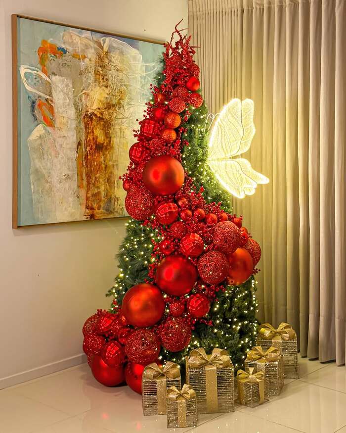 This corner feels like a modern art moment. Ornaments in many red textures pour down one side of the tree in a dramatic cascade, then a warm light butterfly wing glows behind. Gifts in glittering gold stay low and neat. The shape is asymmetric and that movement makes the whole room feel alive. My brain said I can’t do that, and then my hands started wiring.