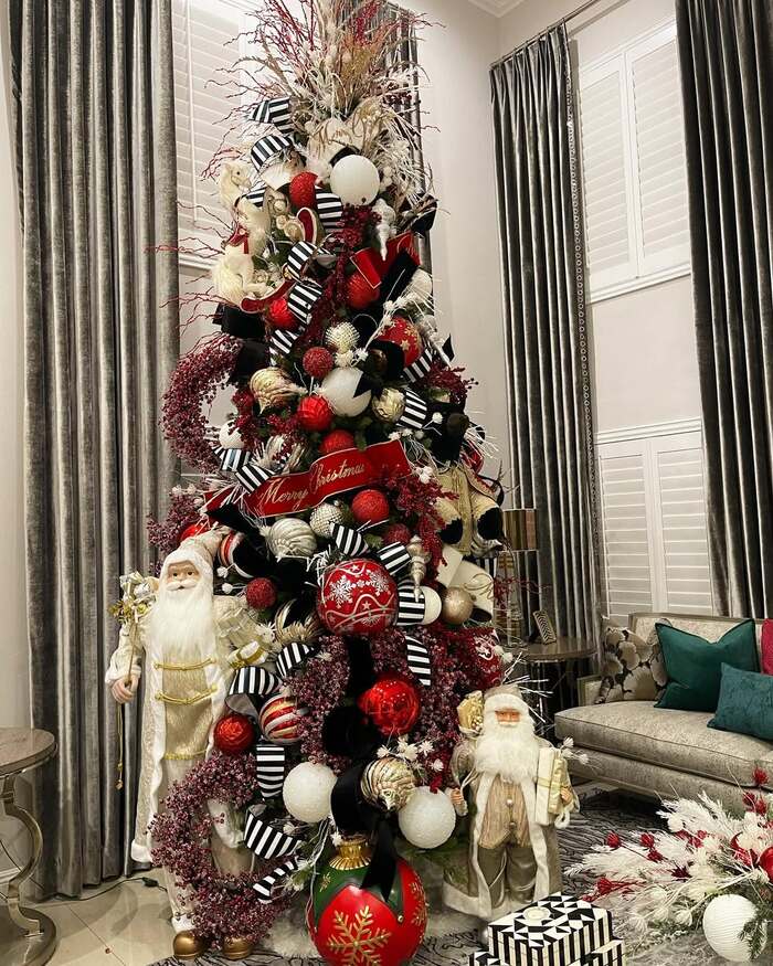 I gasped at the high-contrast ribbon. Wide black-and-white stripes loop through a tall tree loaded with red, cream, and gold. Plum branches and frosted sprays add height, and two old-world Santas guard the base. It’s a little French, a little storybook, and very confident. If you love fashion, this one is your tree.