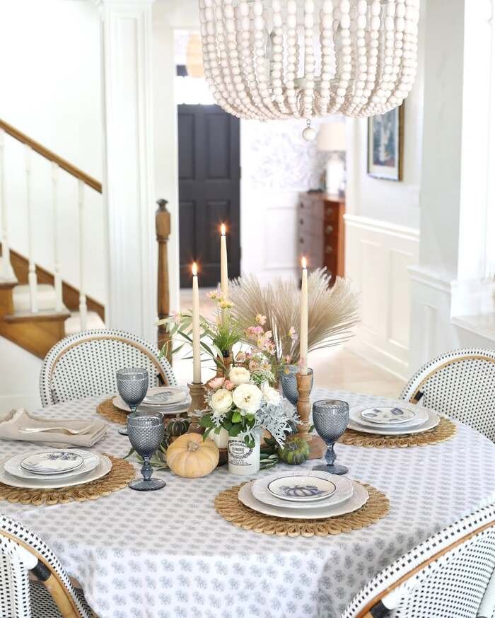 This dining room table decor takes a slightly different direction by using soft, muted pastels. The light, almost feminine hues of the pumpkins and florals create an elegant fall look that feels fresh and airy. I love the use of neutral whites and soft pinks here. They create a serene and relaxing atmosphere that’s perfect for a cozy, intimate fall dinner.