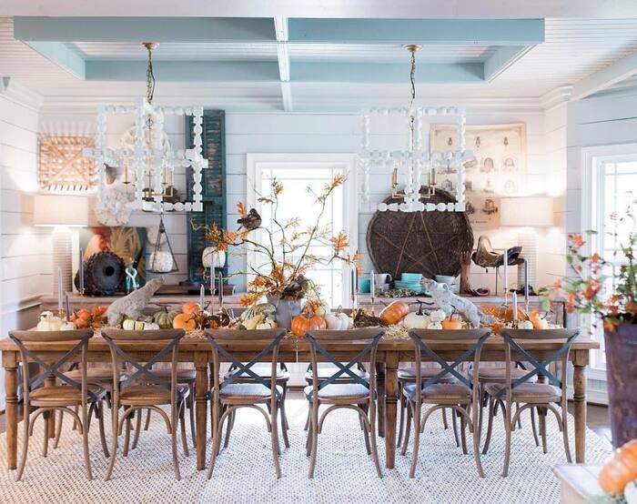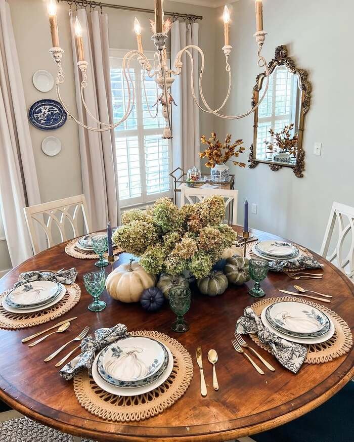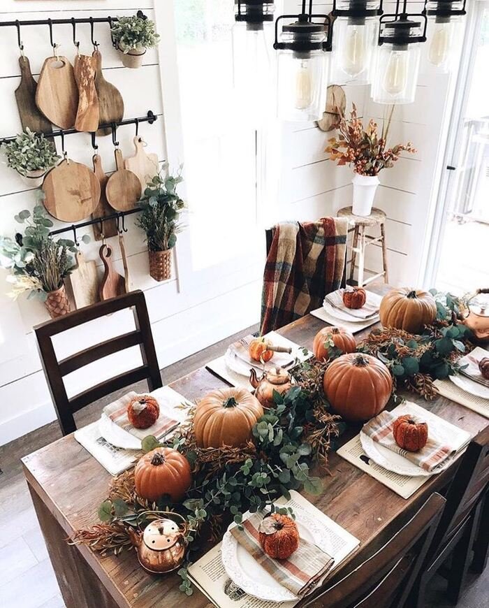If you’re anything like me, fall just wouldn't be the same without pumpkins. But you don’t have to go for the classic orange ones, especially if you want to keep it chic. In one of the beautiful dining room ideas I found, a rustic wooden table was set with a mix of white, orange, and even teal pumpkins, along with a gorgeous garland of eucalyptus leaves.
