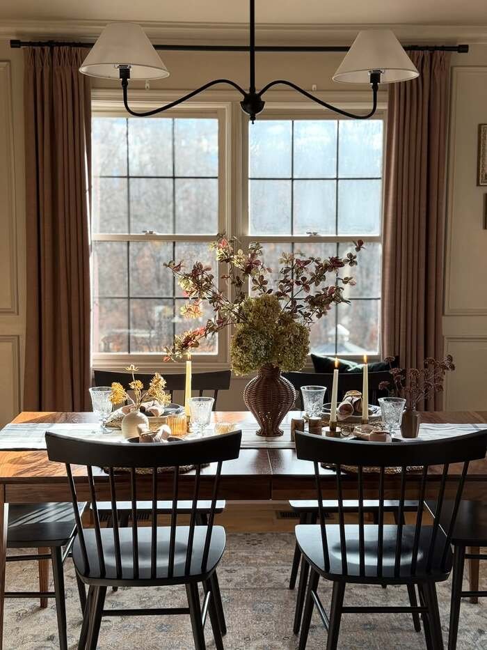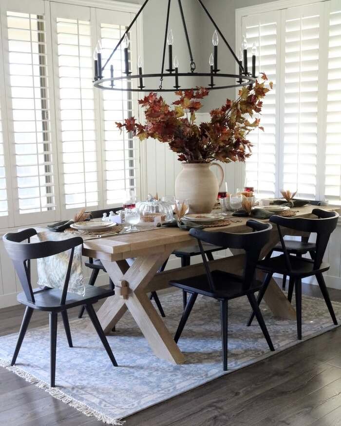 I know what you’re thinking—black and white for fall? Trust me, it works! One Instagram photo I stumbled upon showed a modern table decorated with black chairs and a crisp white tablecloth. The focal point was a stunning vase filled with fall foliage in shades of orange, burgundy, and gold.