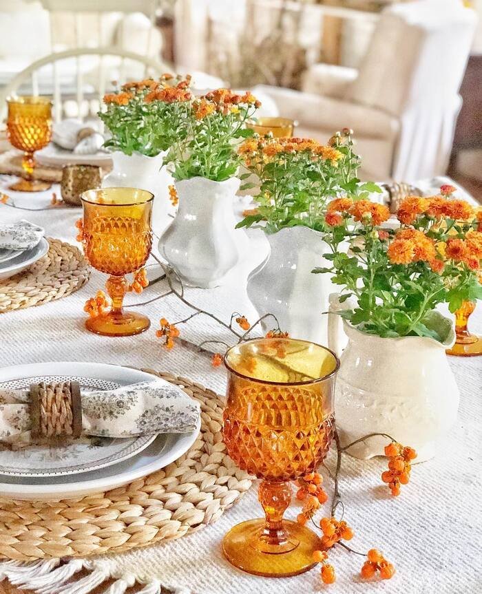 If your style is more about minimalism, you can still bring in the essence of fall with simple, chic decor. A single bouquet of orange chrysanthemums in a clear vase can be placed in the middle of the table, surrounded by a few candles in varying heights. The key to this look is keeping things sparse yet elegant.