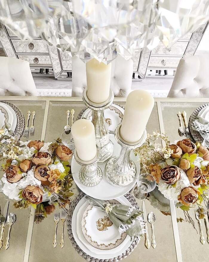 For a bit of fall sparkle, glitz and glam can also make an appearance in your dining room table decor. Think elegant glassware, golden cutlery, and even a touch of crystal or mirrored trays. A stunning idea I found featured a fall-inspired tablescape with lots of candles and metallic pumpkins—this particular look was perfect for someone who wants a little luxury with their seasonal decor.