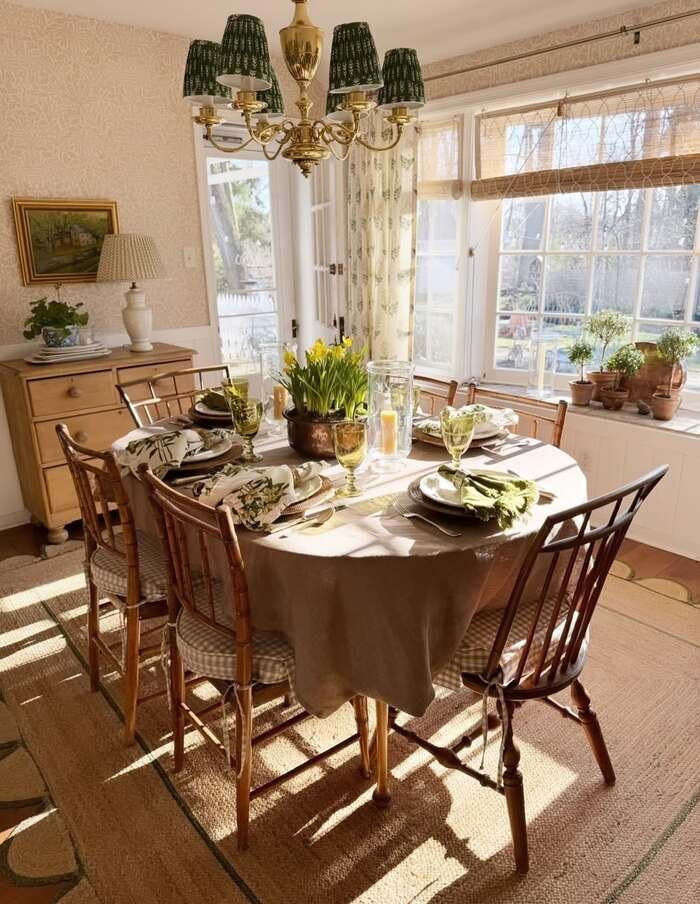 This style is perfect if you love the relaxed charm of a countryside cottage and want to bring that rustic warmth into your home. Top it all off with a simple centerpiece—a bowl of seasonal fruit, a few flowers, or perhaps a few candles in vintage holders. If you can, go for a woven placemat or charger underneath the plates for added texture, giving your table that relaxed yet charming feel.