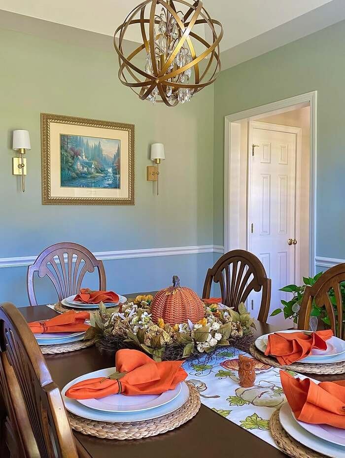 If you’re looking to make a bold statement with your fall dining room table decor, this modern and vibrant design might just be what you need. The black and white plaid table runner adds a fresh, contemporary twist, while the colorful pumpkins and floral arrangements give the table its fall spirit. The unique chandelier above the table is also a standout feature, adding some modern flair.