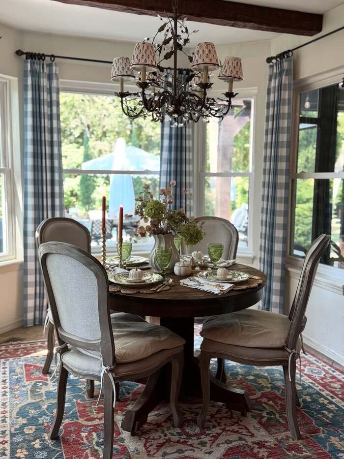 What really drew me to this one was the mix of textures and patterns—checkerboard napkins and soft, plush throw pillows on the chairs made this dining room feel so inviting. The key to making this work is layering: don't be afraid to mix natural textures, like linen with woven wicker, to create that warm, lived-in fall feeling.