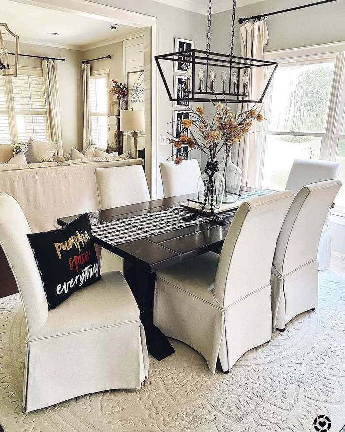 It’s all about the contrast. The black and white combo adds a touch of sophistication to any fall dining room table decor. Pair it with gold flatware and a bit of greenery to keep the look fresh, and you’ve got yourself a dining setup that’s perfect for entertaining during the fall months.