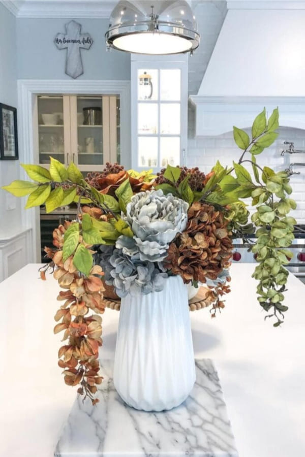 - Bright kitchen with white cabinets: bronze hydrangea plus trailing greens for contrast.