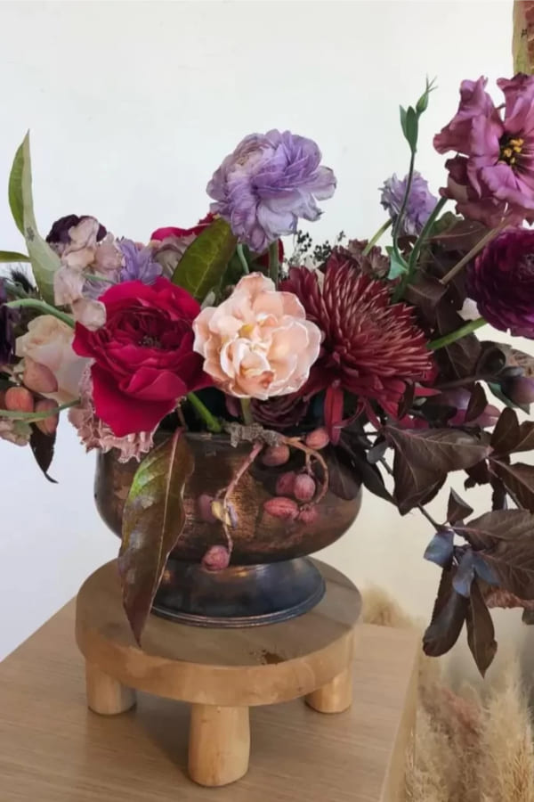 I adore the low copper compote with burgundy, mauve, and blush. Roses, ranunculus, one spiky chrysanthemum, and leaves so dark they feel like chocolate. It turns noon into candlelight.