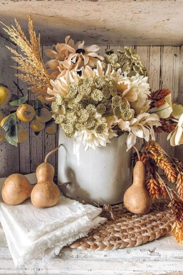 - Farmhouse shelf: crock with wheat and gourds. Textures do the heavy lifting.