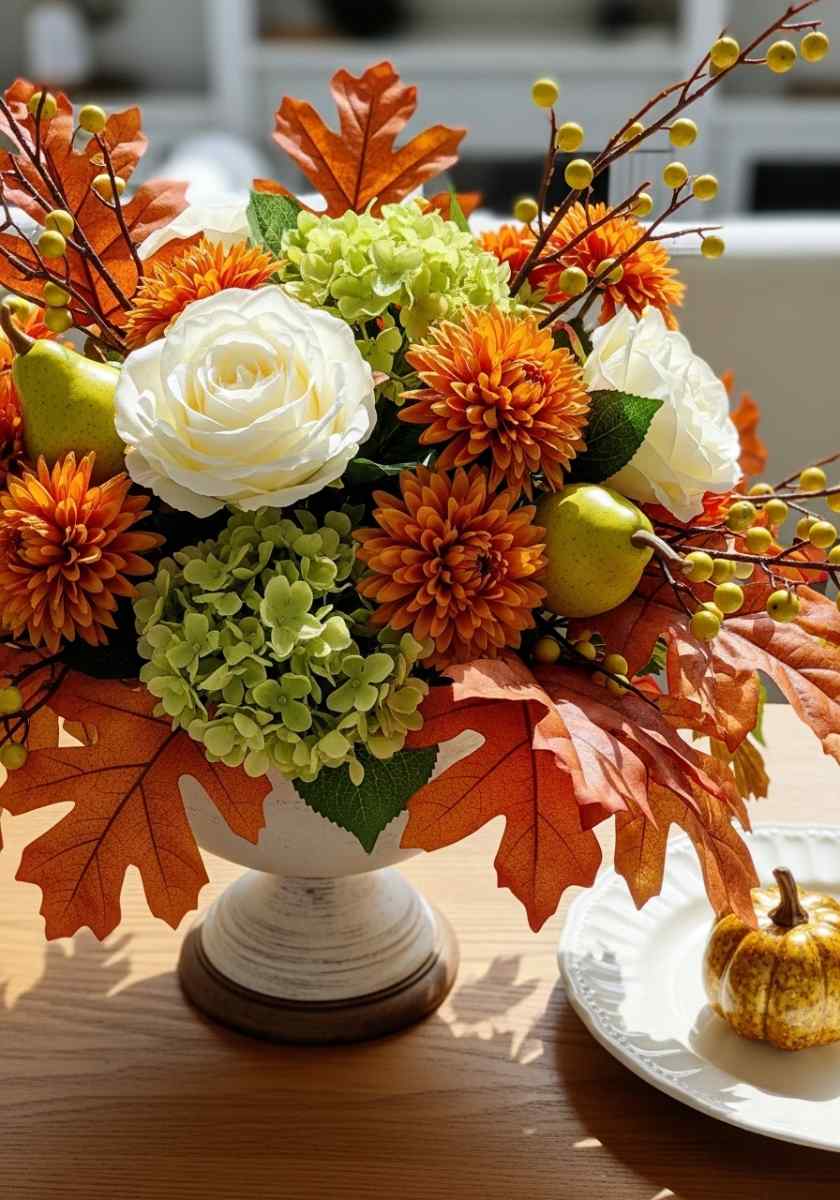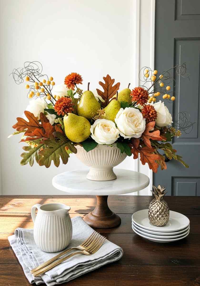I’m an easy sell for fruit in arrangements. It feels generous. In a footed cream compote, I build a low bed of ruscus and oak leaves, then add white garden roses and small rust mums. Faux pears sit nest-like between blooms.