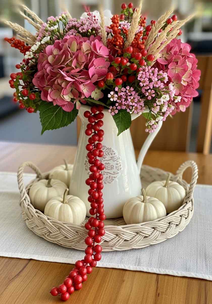 Pink Hydrangea Pitcher with Cascading Berries