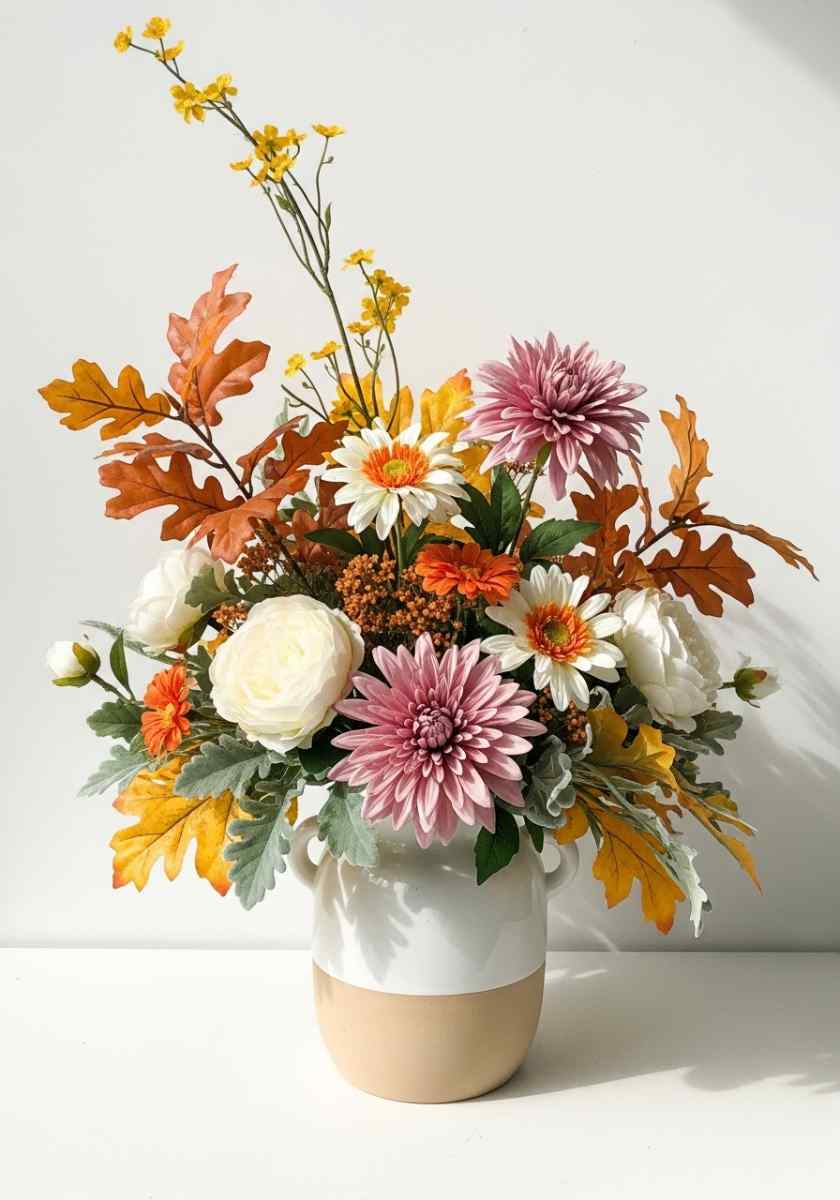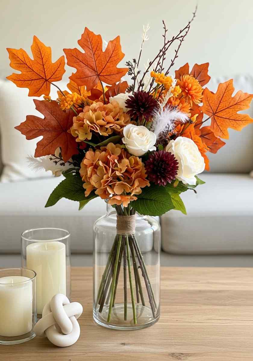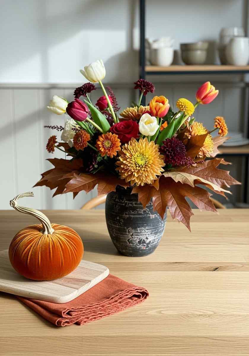 This piece fits modern rooms that still want warmth, and it lands squarely in the autumn flower arrangements category with a bit of fashion energy.