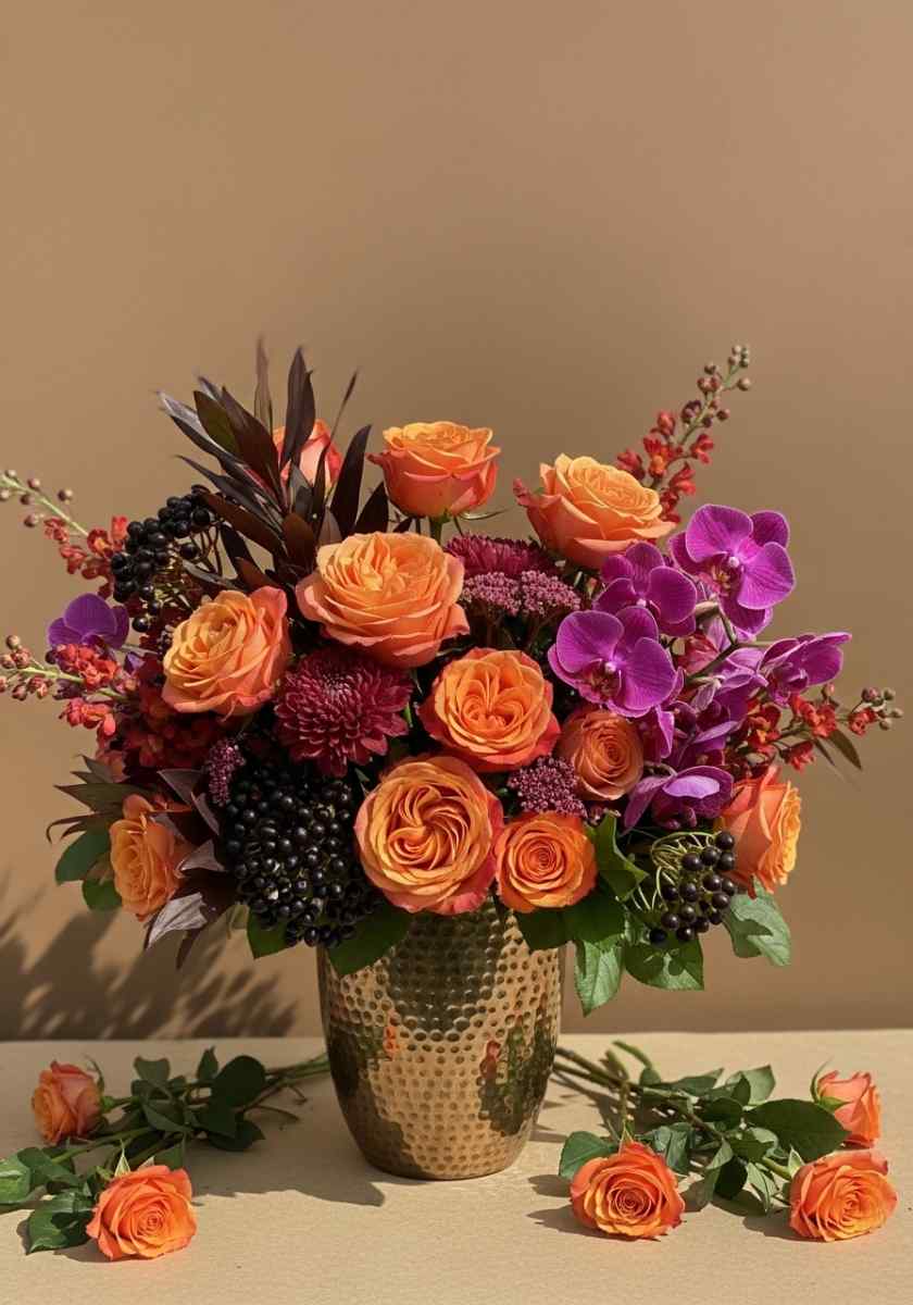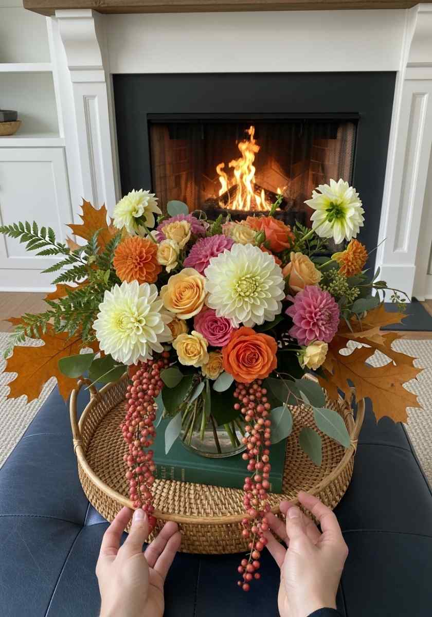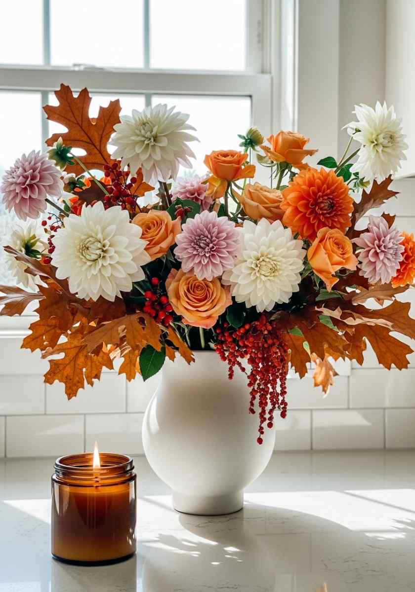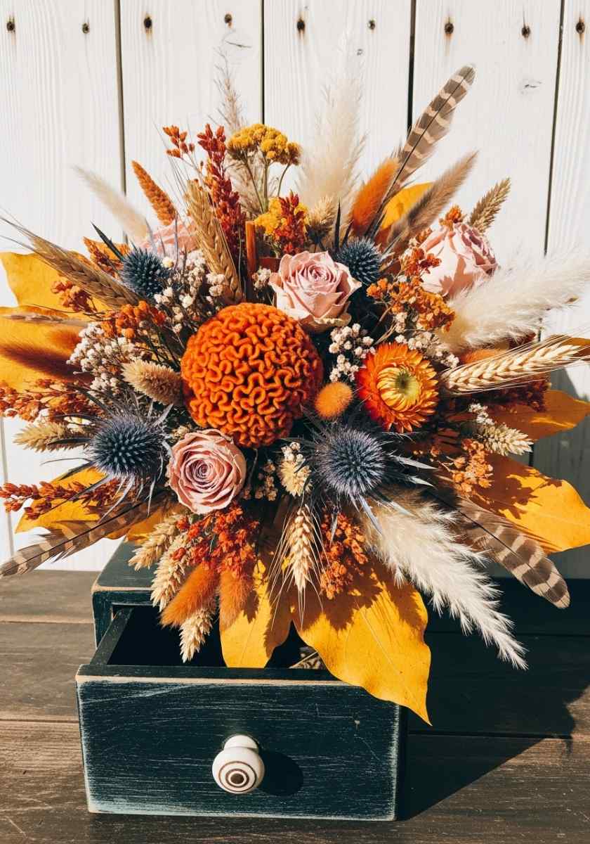 This piece fits modern rooms that still want warmth, and it lands squarely in the autumn flower arrangements category with a bit of fashion energy.