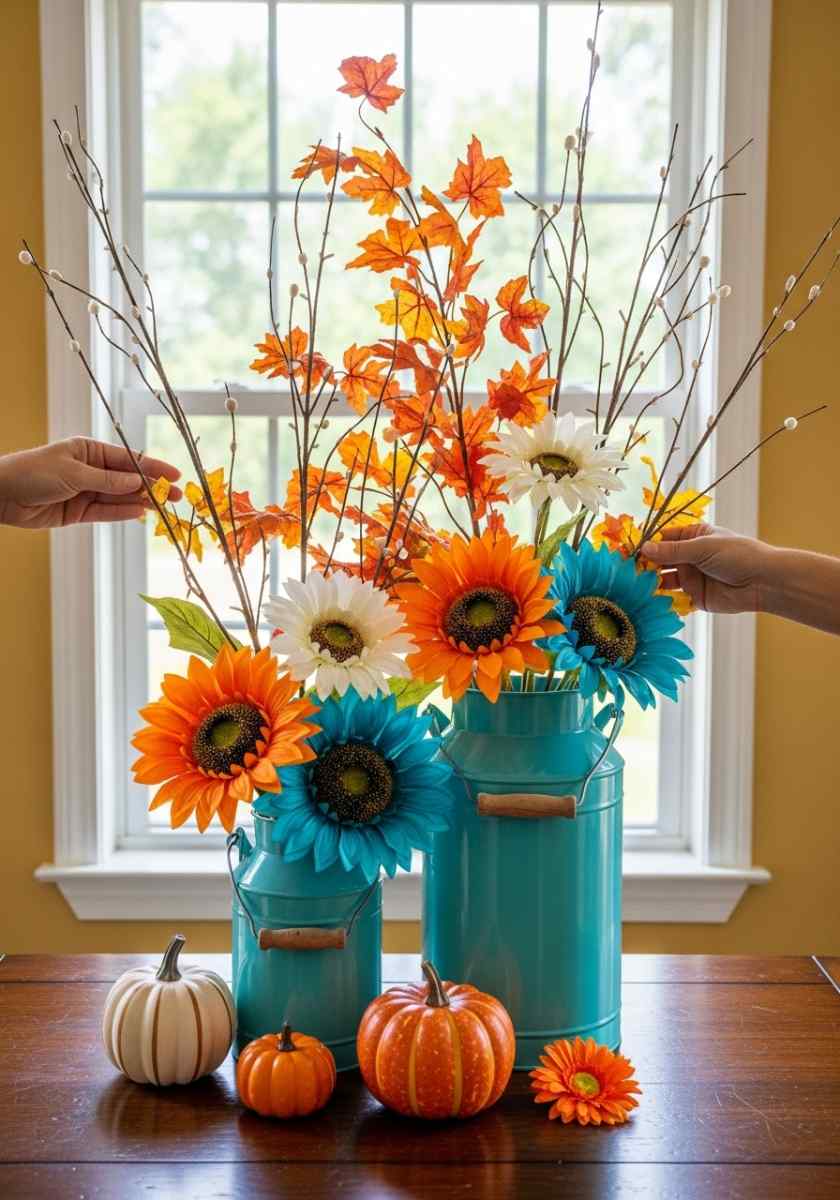 Color theory time but not boring. Teal and orange are opposites on the wheel so they vibrate in a happy way. That’s why this trio of teal milk cans with sunflowers slaps. I place the tallest can in back with branches and orange maple leaves.