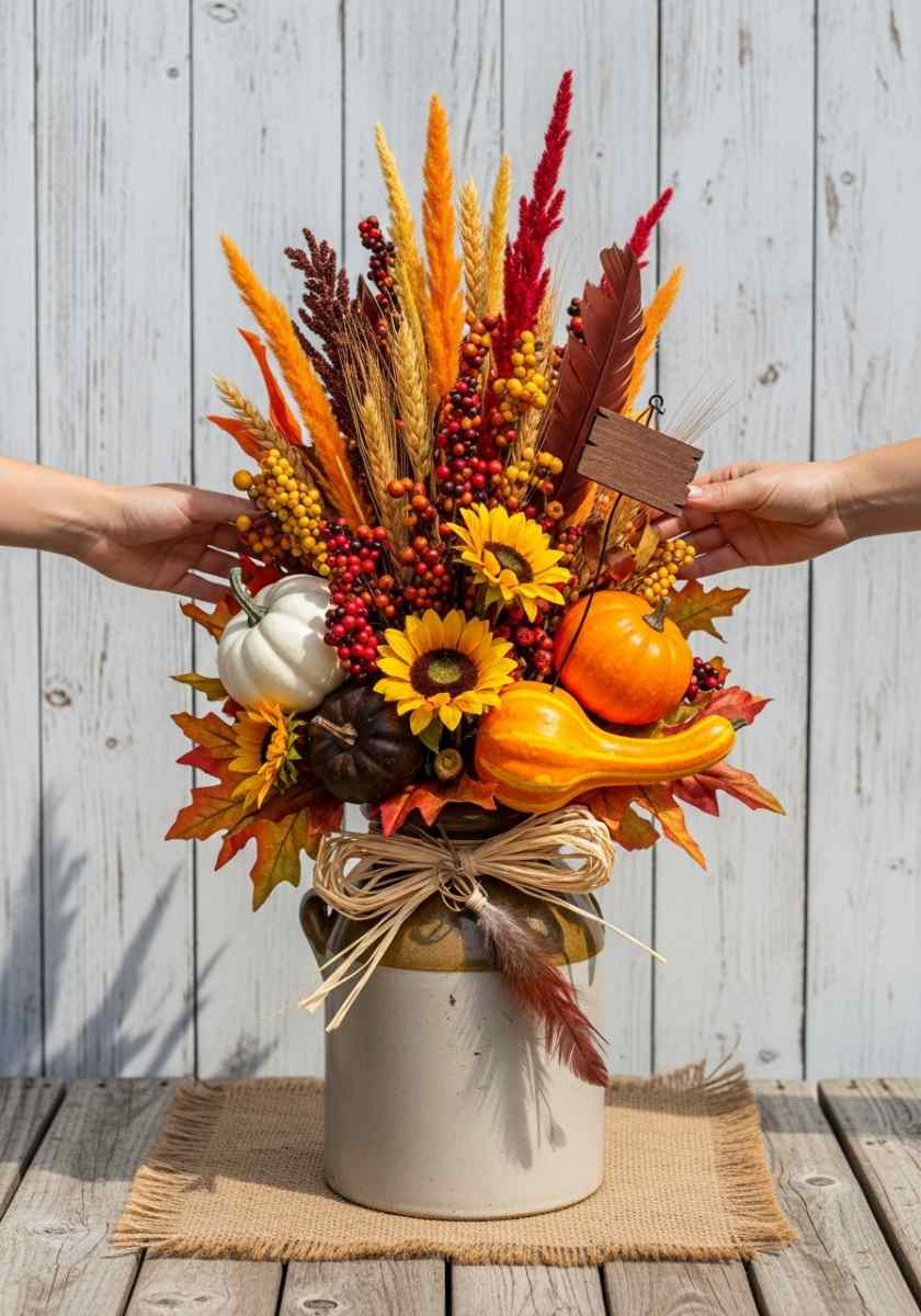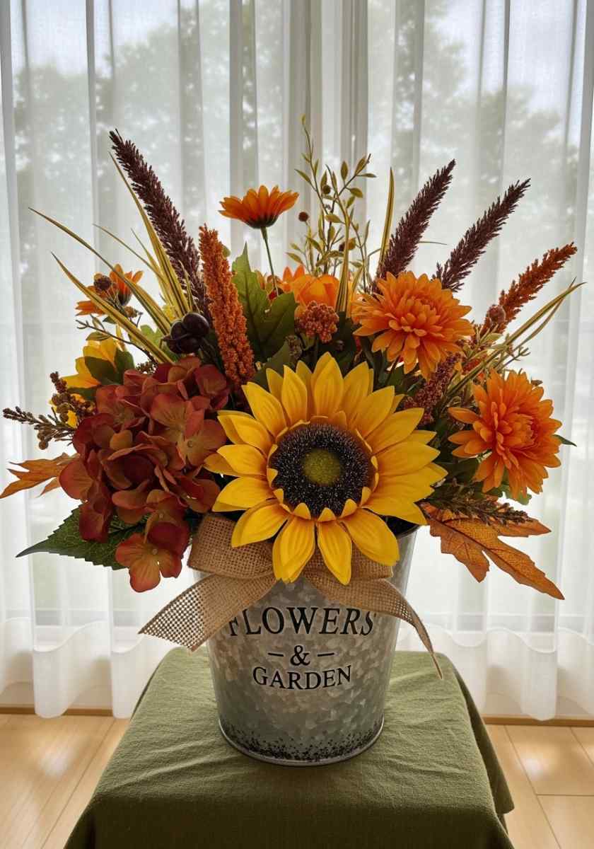 For the foyer or kitchen corner, try a galvanized bucket with a burlap bow. I fill it with one giant sunflower, rust mums, maroon hydrangea, millet spikes, and foxtail grass. Leaves in mustard and copper close the gaps. The shape is up-and-out like a cheerful fan.