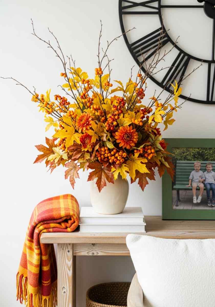 It still reads seasonal because of the branches, but it doesn’t compete with colorful throws or artwork. File under autumn floral centerpieces for quiet spaces, and yes, it’s still a fall bouquet even without orange.