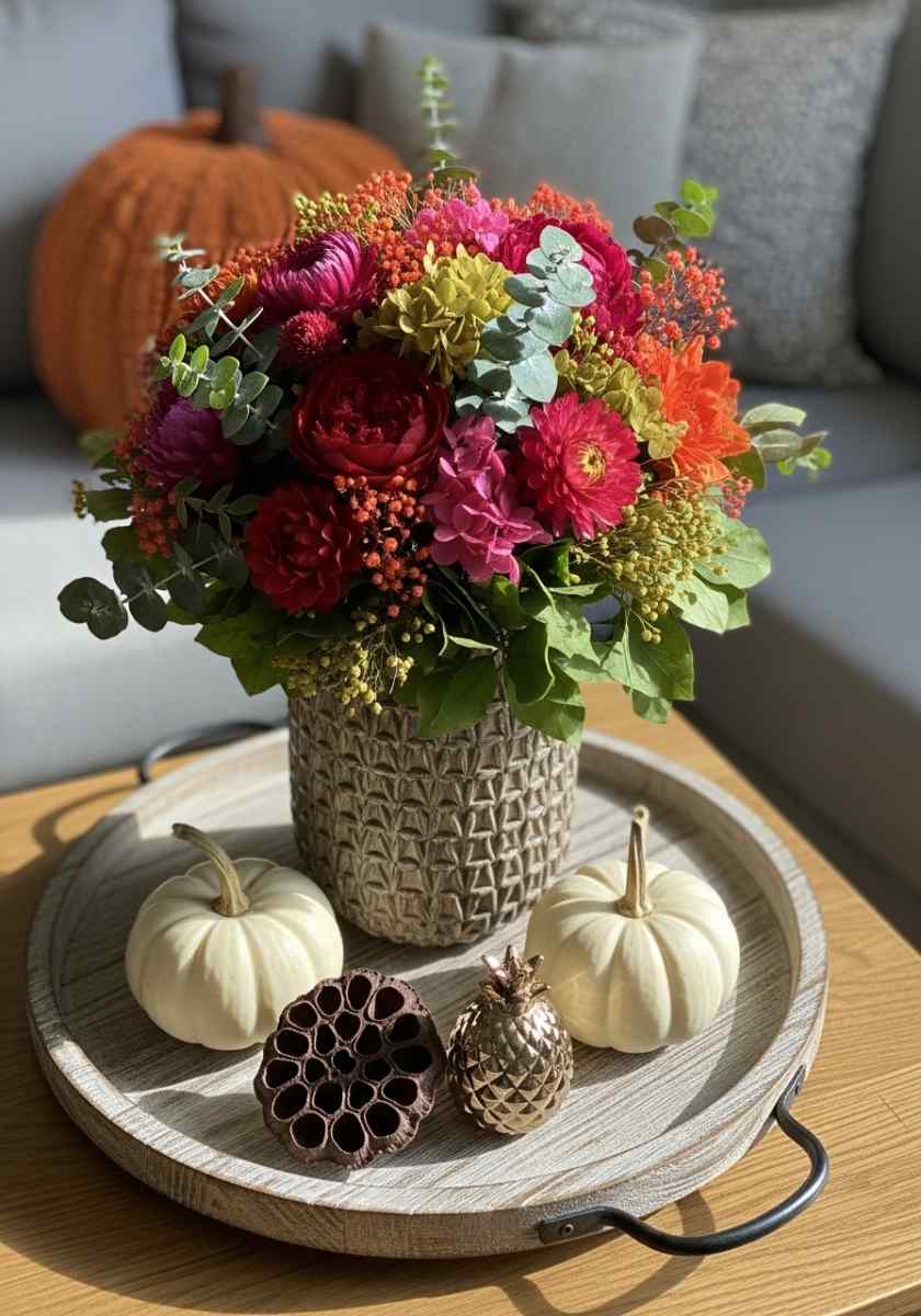 This is your movie-night showoff. I place a textured stone pot in a wooden tray with two mini white pumpkins and a small metal accent for sparkle. Inside the pot I make a sturdy tape grid so I can pack stems pretty tight.