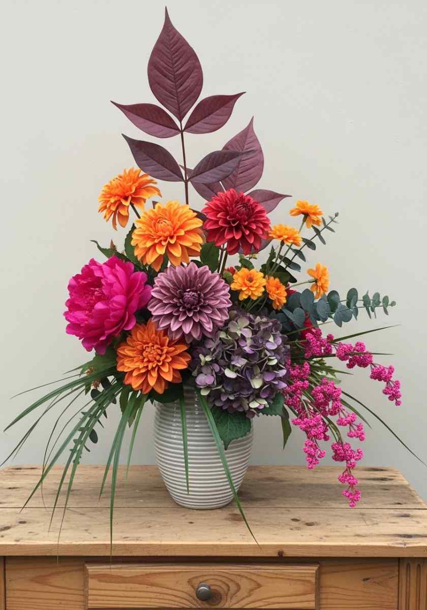 Time to play with contrast. In a ribbed white vase I create a triangle. Back left gets tall burgundy leaves, back right gets long pink berry tassels. The base is chunky purple hydrangea. Then I add big dahlias in tangerine and wine, a single hot pink peony, and small orange zinnias as spark points.