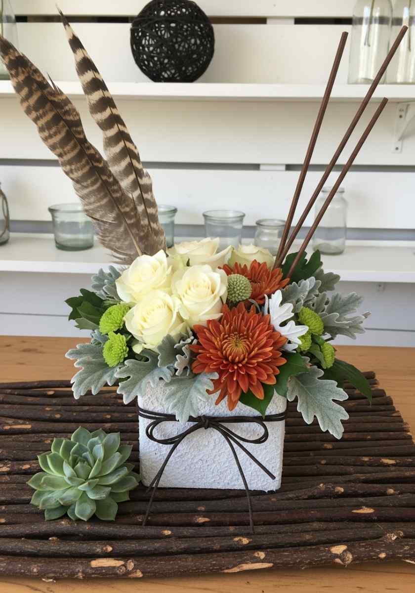 Square containers ask for calm structure. I line mine with a small foam block and cover edges using dusty miller and baby eucalyptus. In front, I nest a pocket of creamy white roses, then tuck rust mums to the right for color weight. Two tall striped feathers go left and three reed sticks go right to balance. The bow is thin leather string tied in a simple loop.