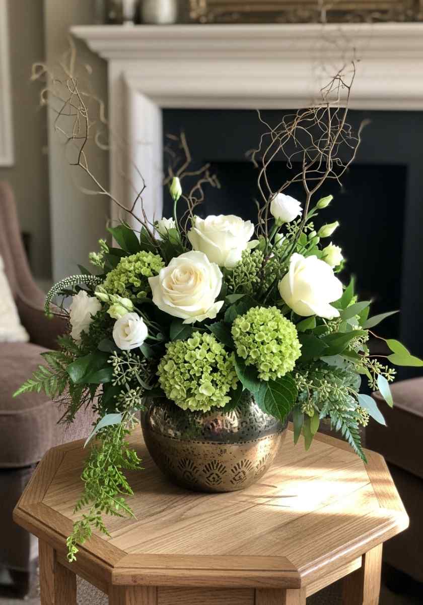 Not every room wants pumpkin spice. Sometimes it craves a breath. I use ivory roses, pale green hydrangeas, fern, and a few curly willow twigs to sketch the outline. Keep the palette tight and the stems medium height. The vessel has a cut pattern that catches candlelight.