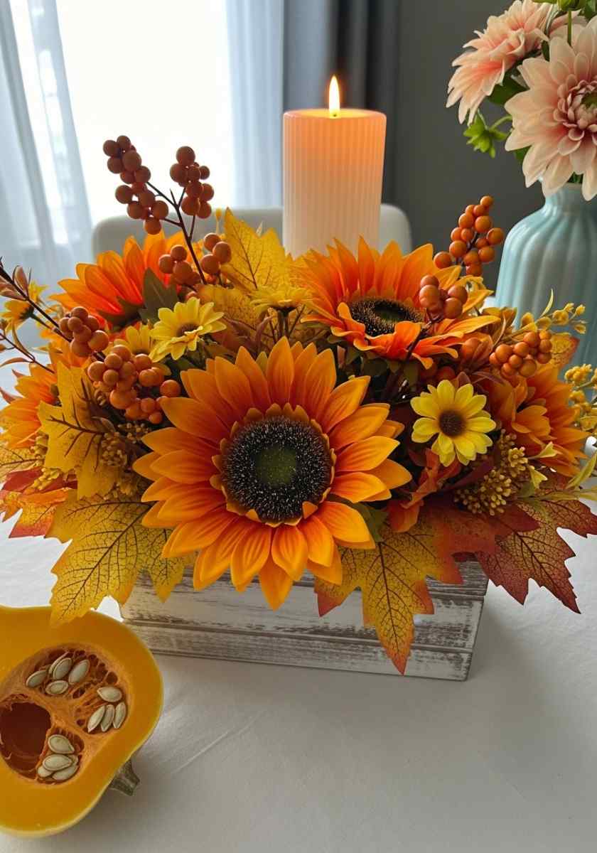 This one brings cheer to weeknight dinners. A long weathered box becomes a mini flower bed. I line it with three mason jars so I can refresh water easily. Inside, I mix bright sunflowers, small daisies, orange berries, and golden leaves.